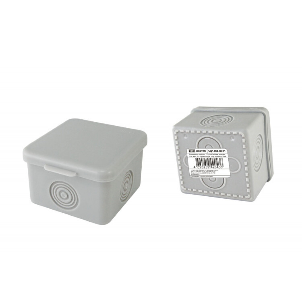 Описание Распаячная коробка ОП 65х65х50мм, крышка, IP54, 4вх., без гермовводов, инд. штрихкод SQ1401-0821