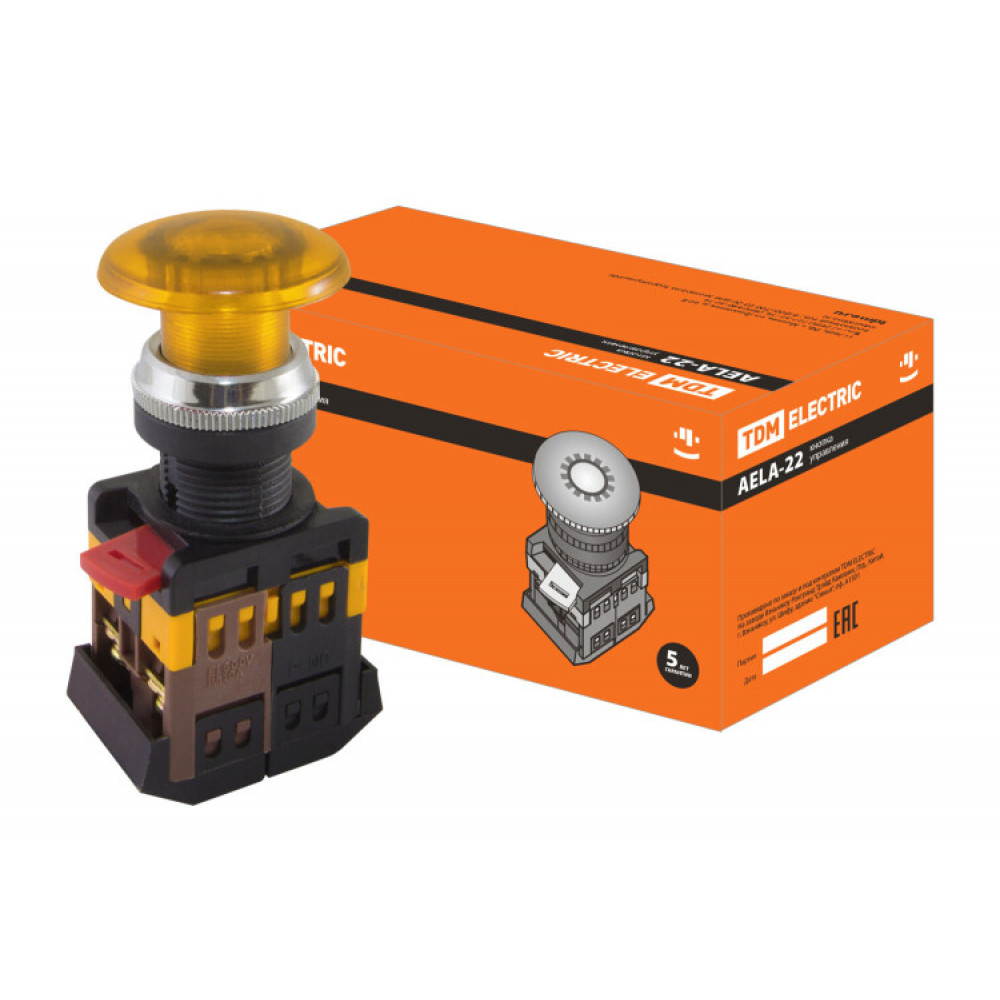 Описание Кнопка AELA-22 "Грибок" желтый d22мм неон/230В 1з+1р SQ0704-0034