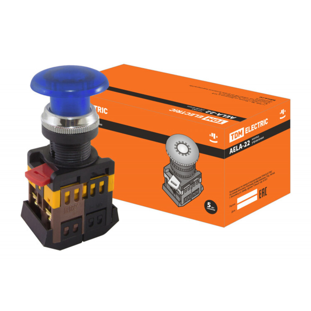 Описание Кнопка AELA-22 "Грибок" синий d22мм неон/230В 1з+1р SQ0704-0035