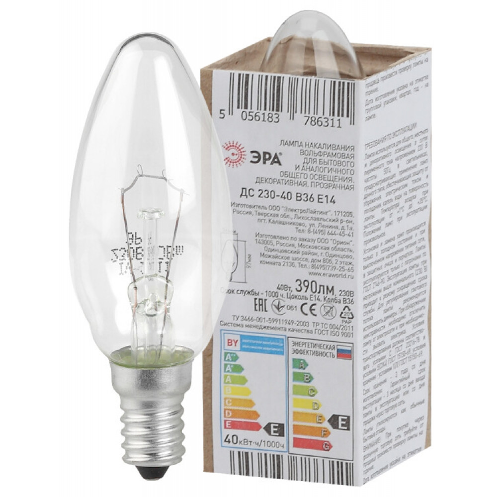 ДС (B36) свечка 40Вт 230В Е14 в гофре (100/6000) Б0039125, Лампа накаливания