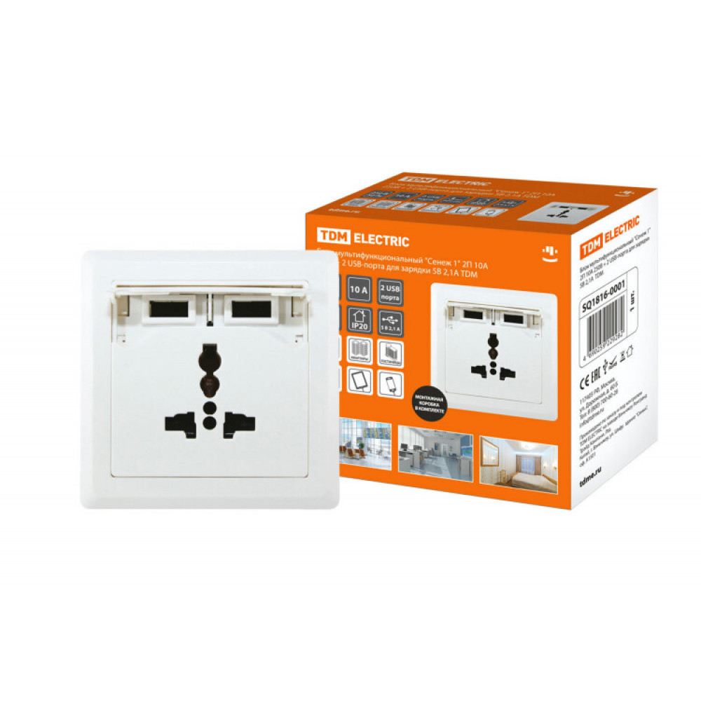 Описание Блок мультифункциональный "Сенеж 1" 2П 10А 250В + 2 USВ-порта для зарядки 5В 2,1А белый нМ SQ1816-0001