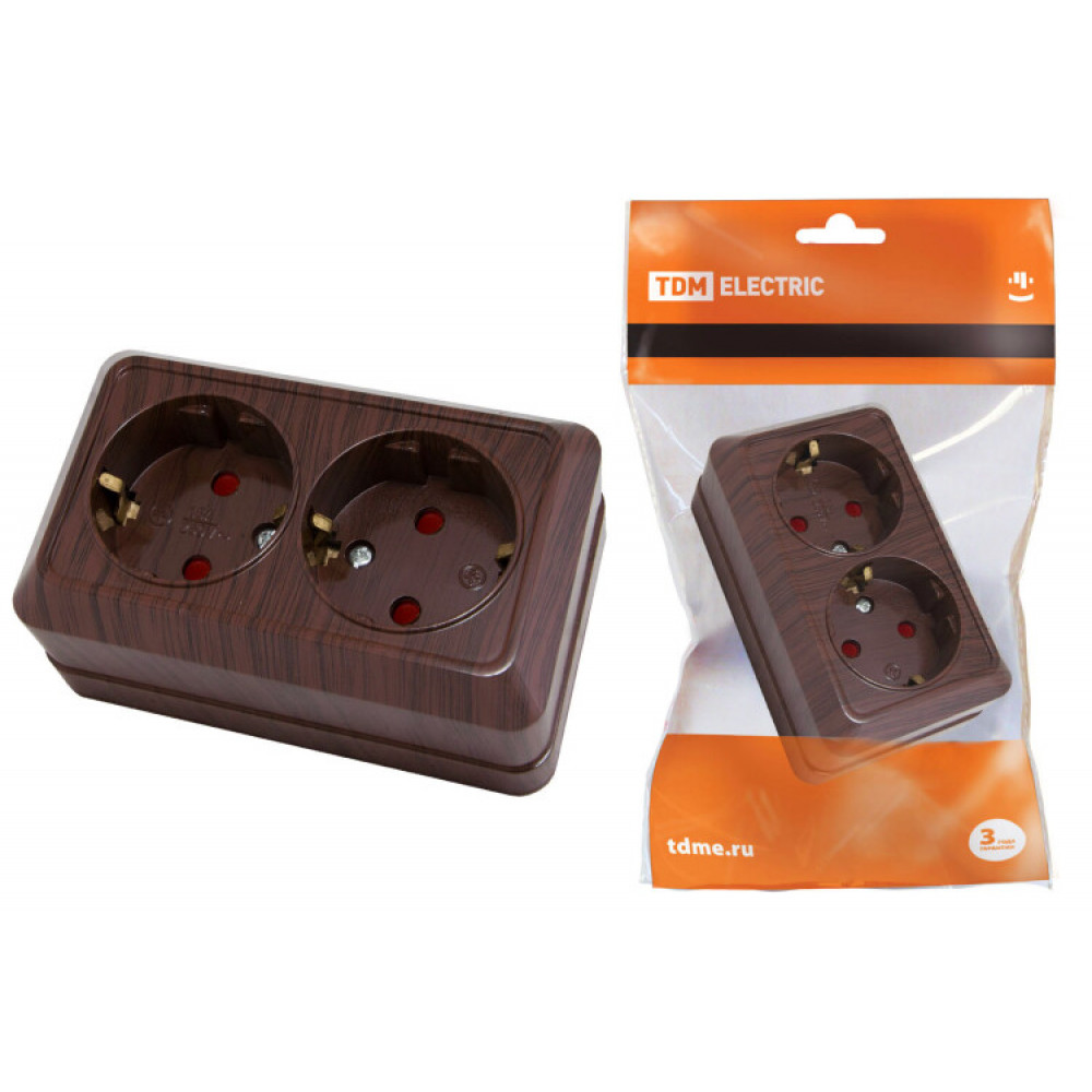 Описание Розетка двойная 2П+З открытой установки с з/ш IP20 16А, бук "Ладога" SQ1801-0040