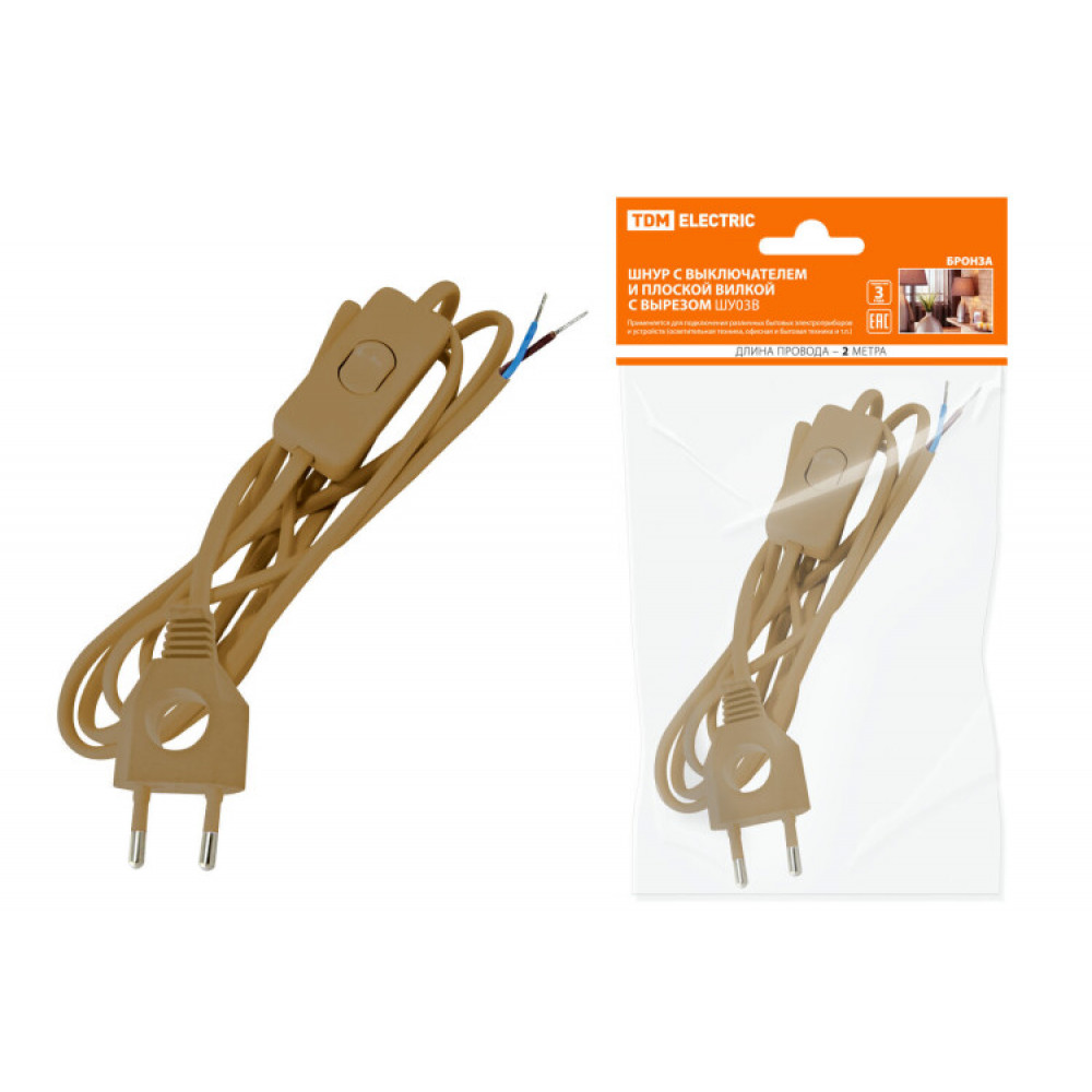 Описание Шнур с выключателем и плоской вилкой с вырезом ШУ03В ШВВП 2х0,75мм2 2 м. бронза SQ1305-0023
