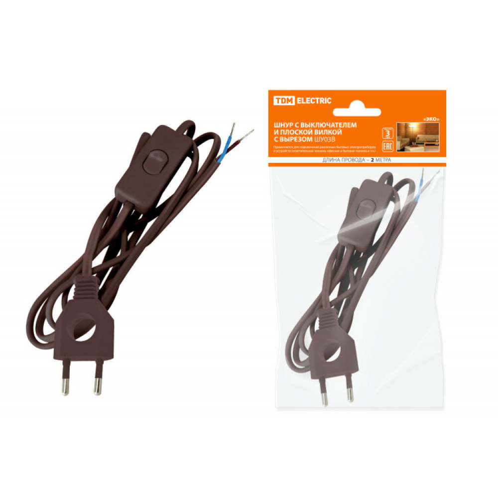 Описание Шнур с выключателем и плоской вилкой с вырезом ШУ03В ШВВП 2х0,75мм2 2 м. коричневый "ЭКО" SQ1305-0026