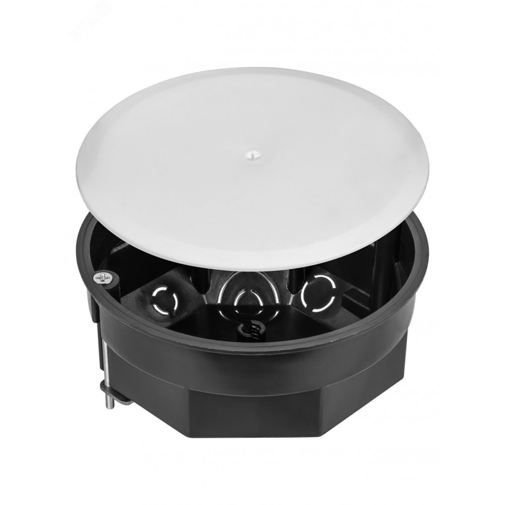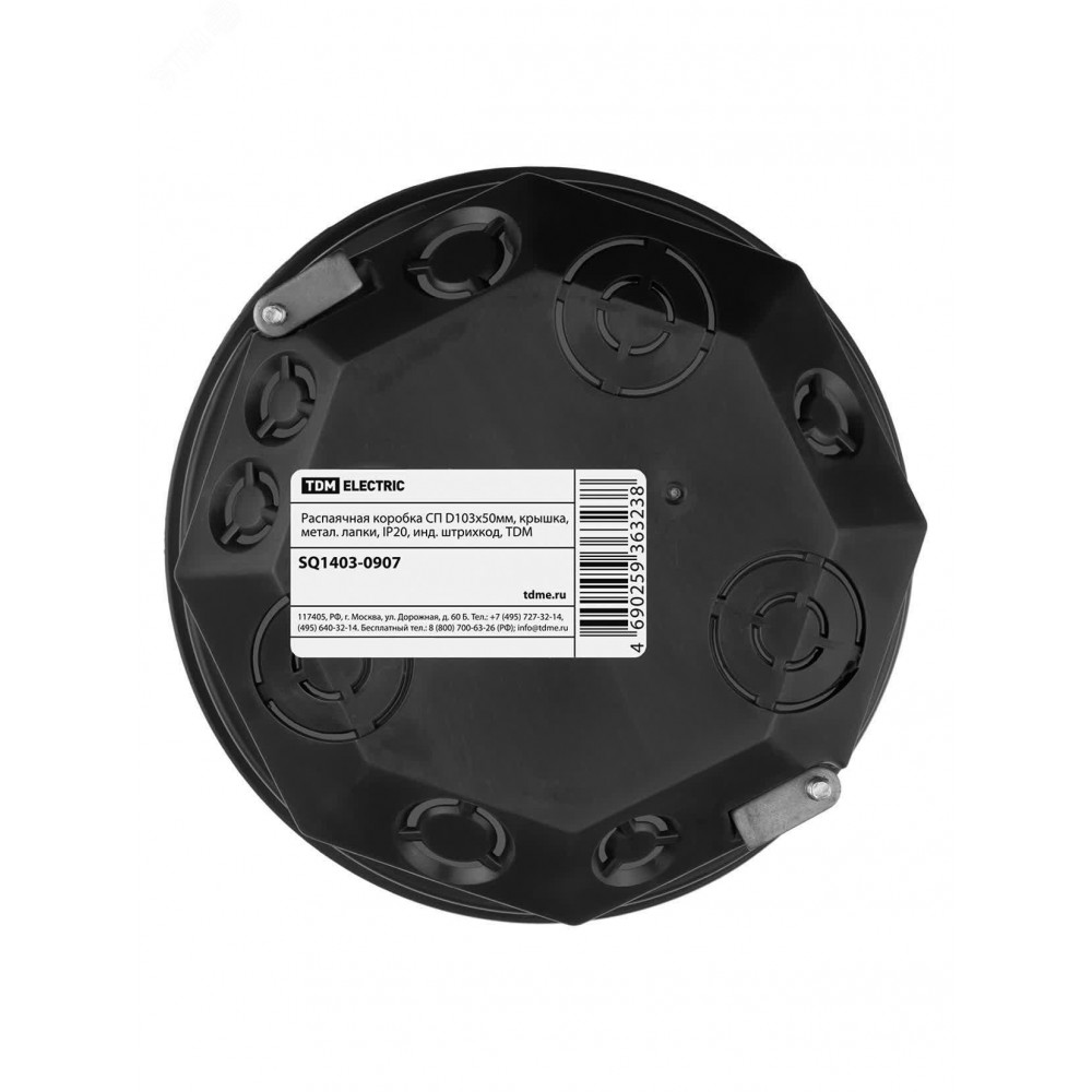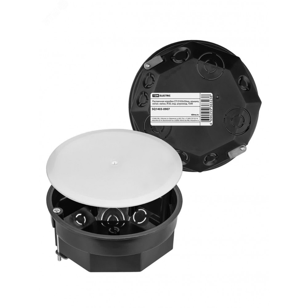 Описание Распаячная коробка СП D103х50мм, крышка, метал. лапки, IP20, инд. штрихкод, SQ1403-0907
