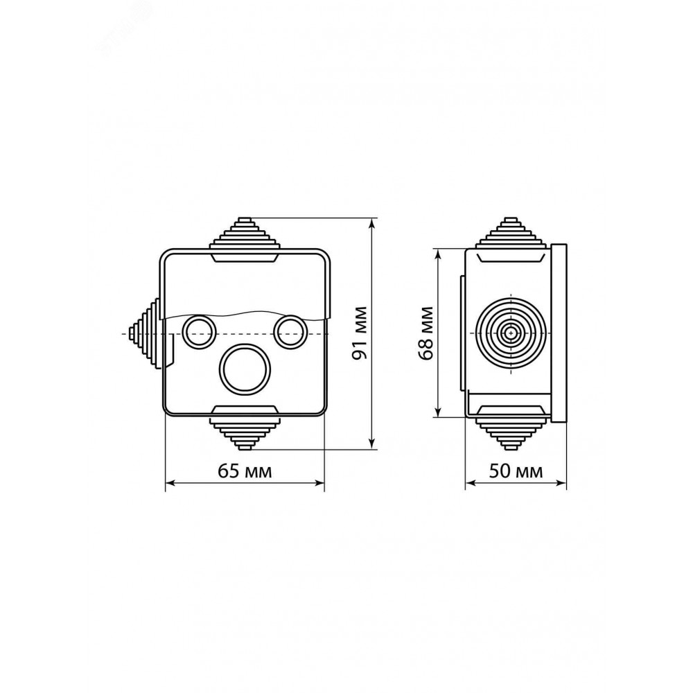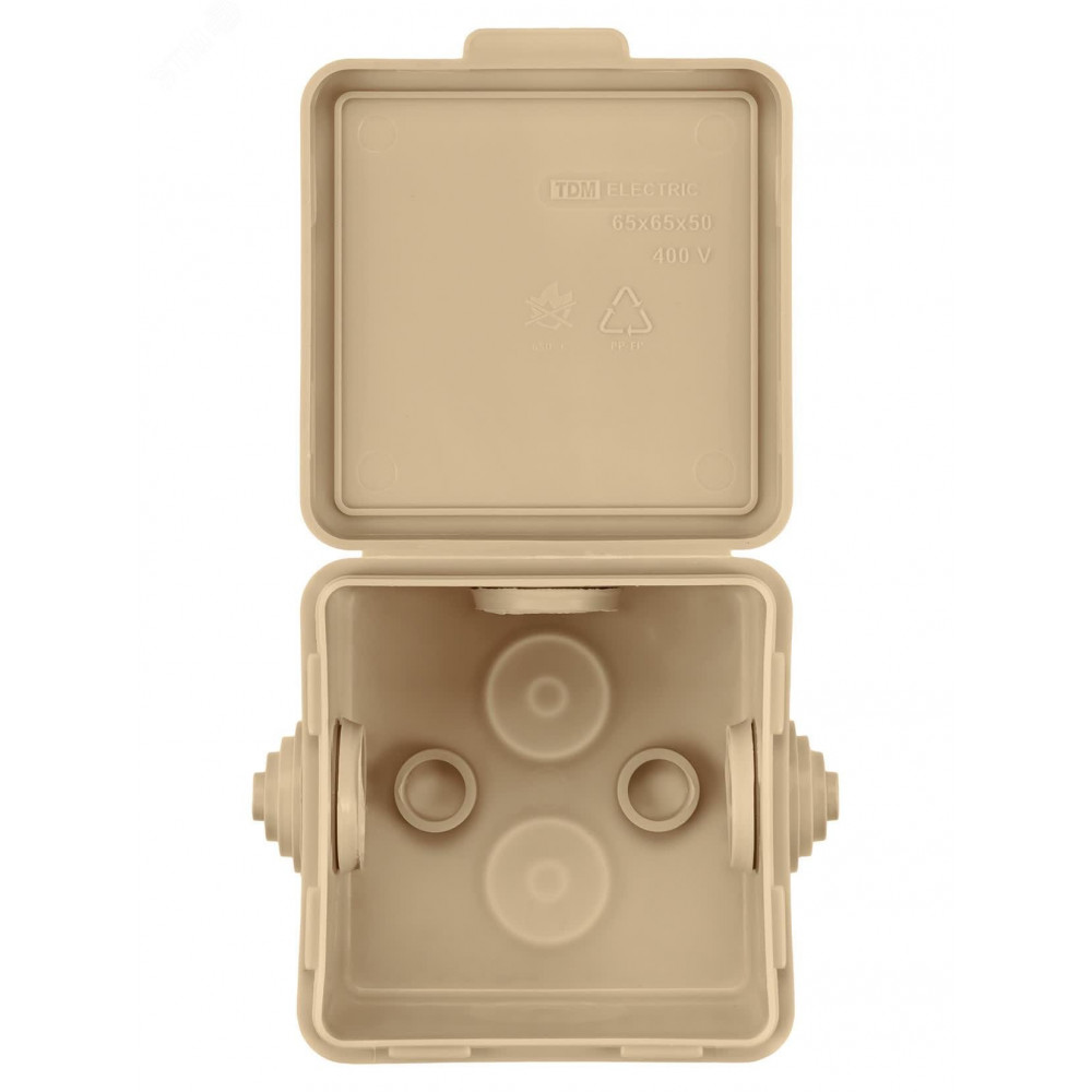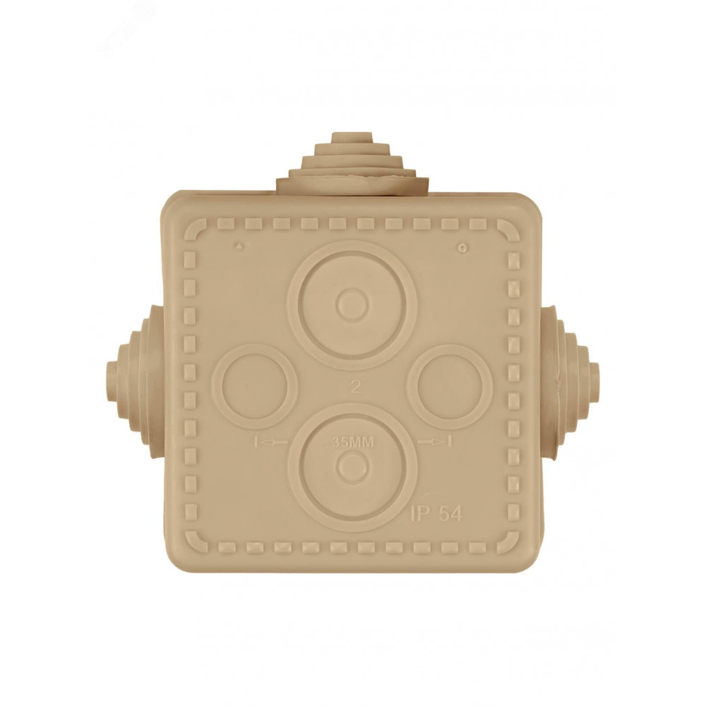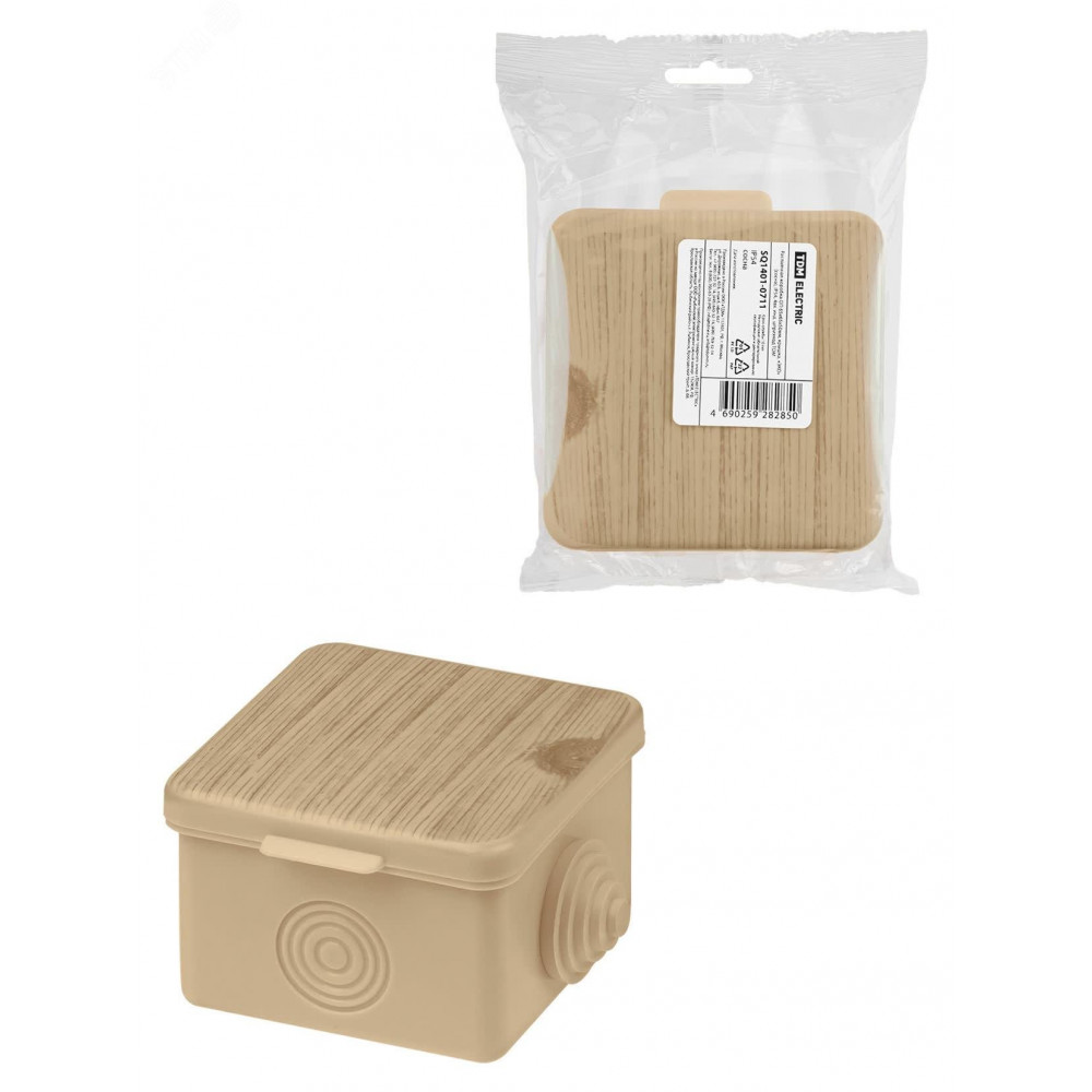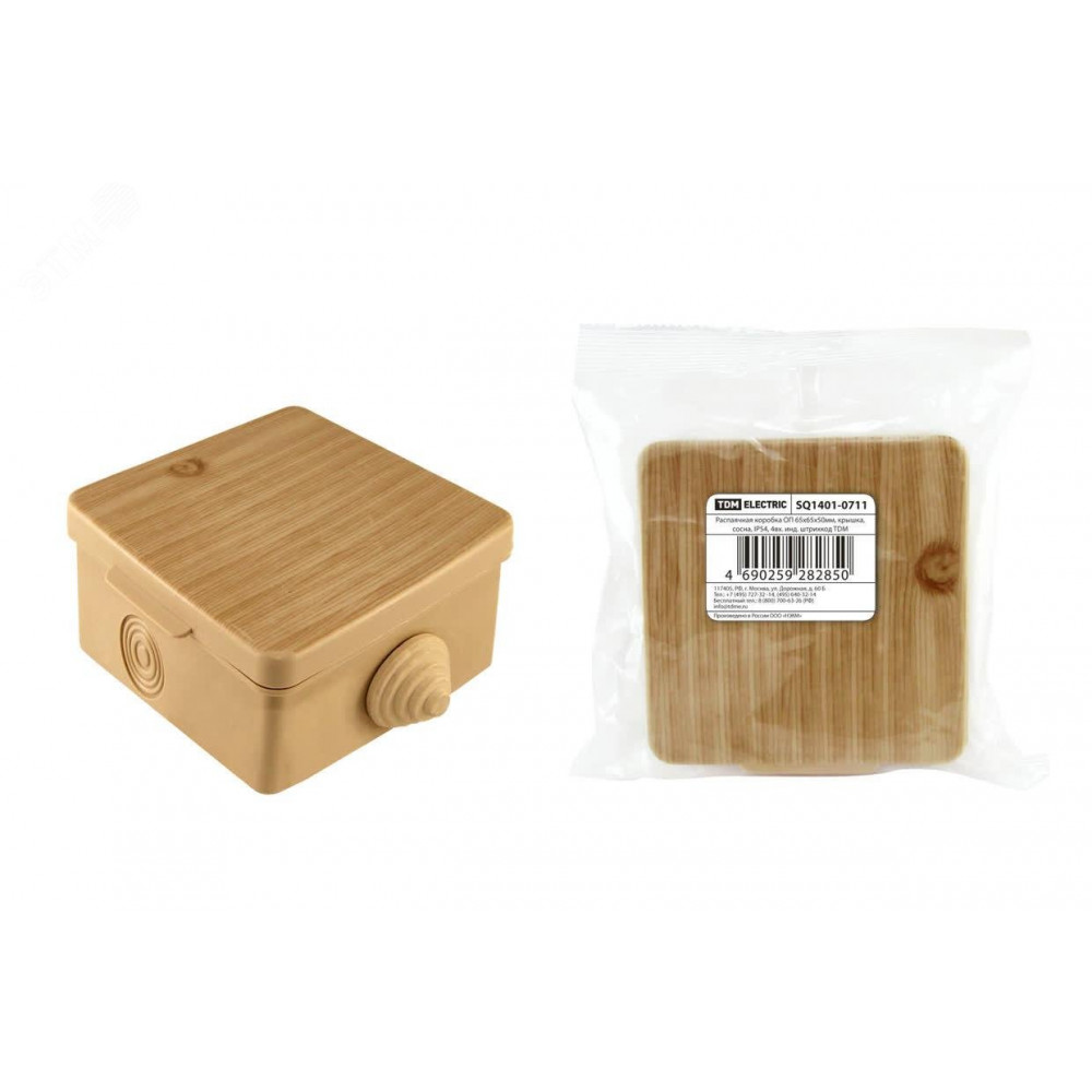 Описание Распаячная коробка ОП 65х65х50мм, крышка, "ЭКО" (сосна), IP54, 4вх. инд. штрихкод SQ1401-0711