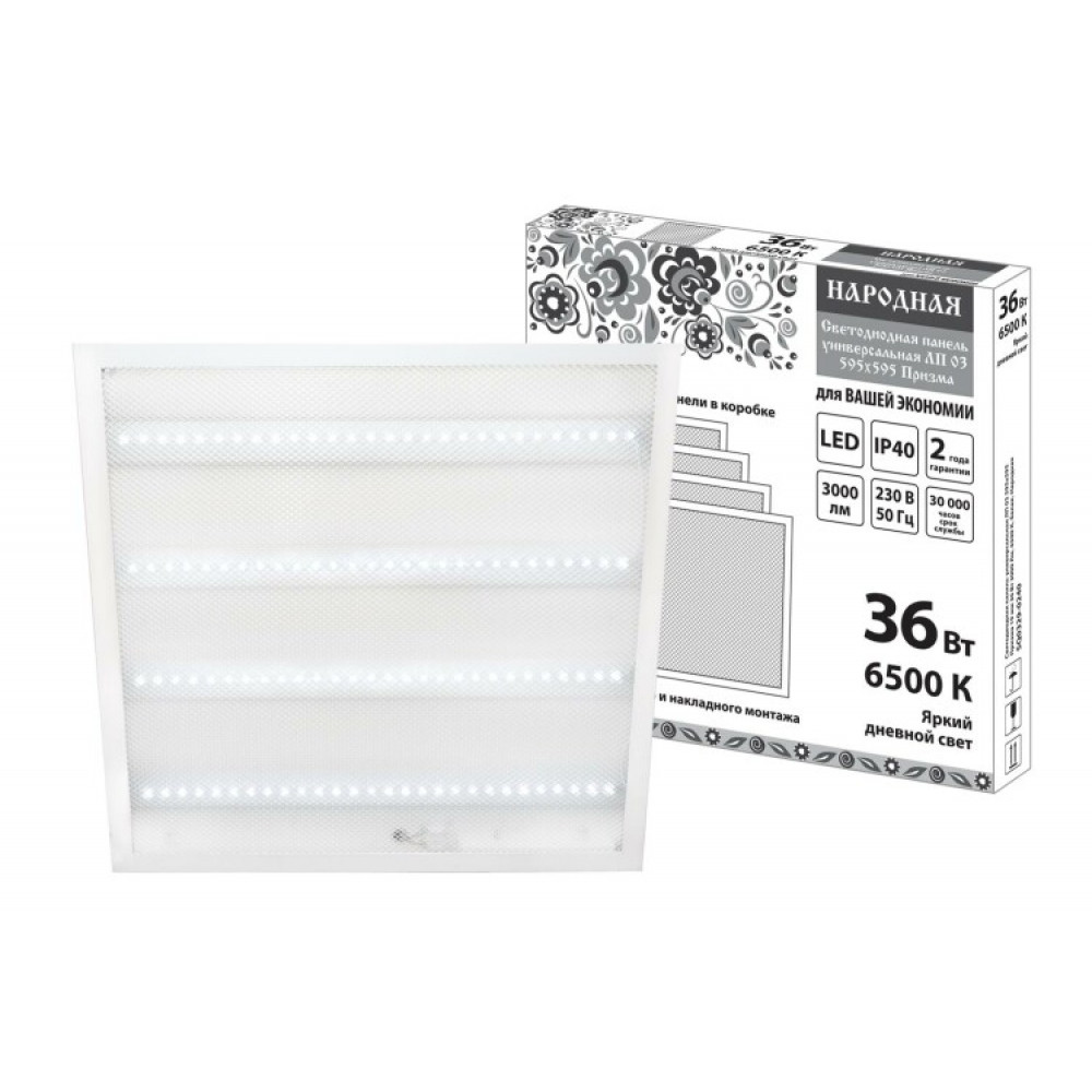 Описание Светодиодная панель универсальная ЛП 03 595х595 Призма 19 мм 36 Вт 3000 Лм, 6500 К, белая, Народная SQ0329-0240