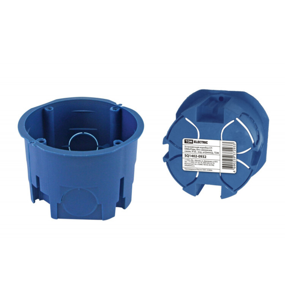 Описание Установочная коробка СП D68х45мм, без саморезов, синяя, IP20, инд. штрихкод, SQ1402-0932