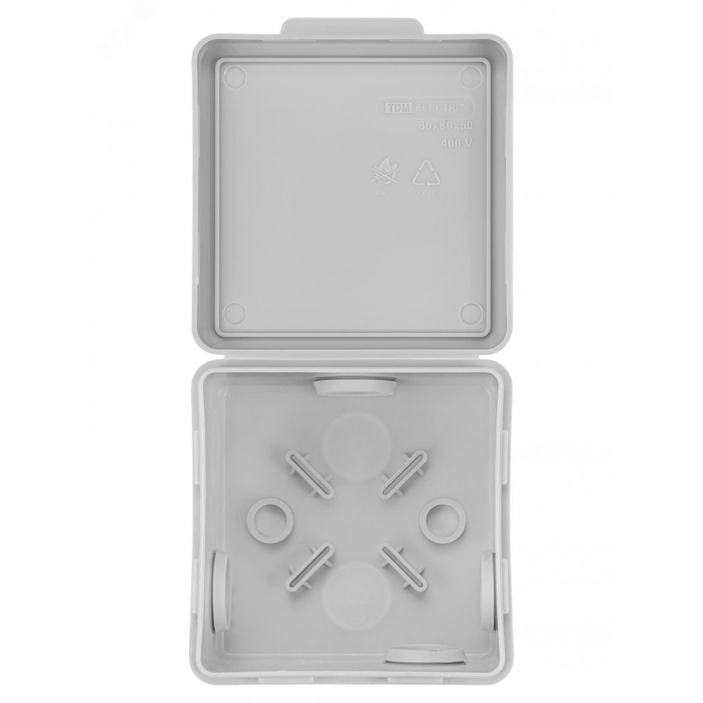 Описание Распаячная коробка ОП 80х80х50мм, крышка, IP54, 7вх., без гермовводов SQ1401-0812