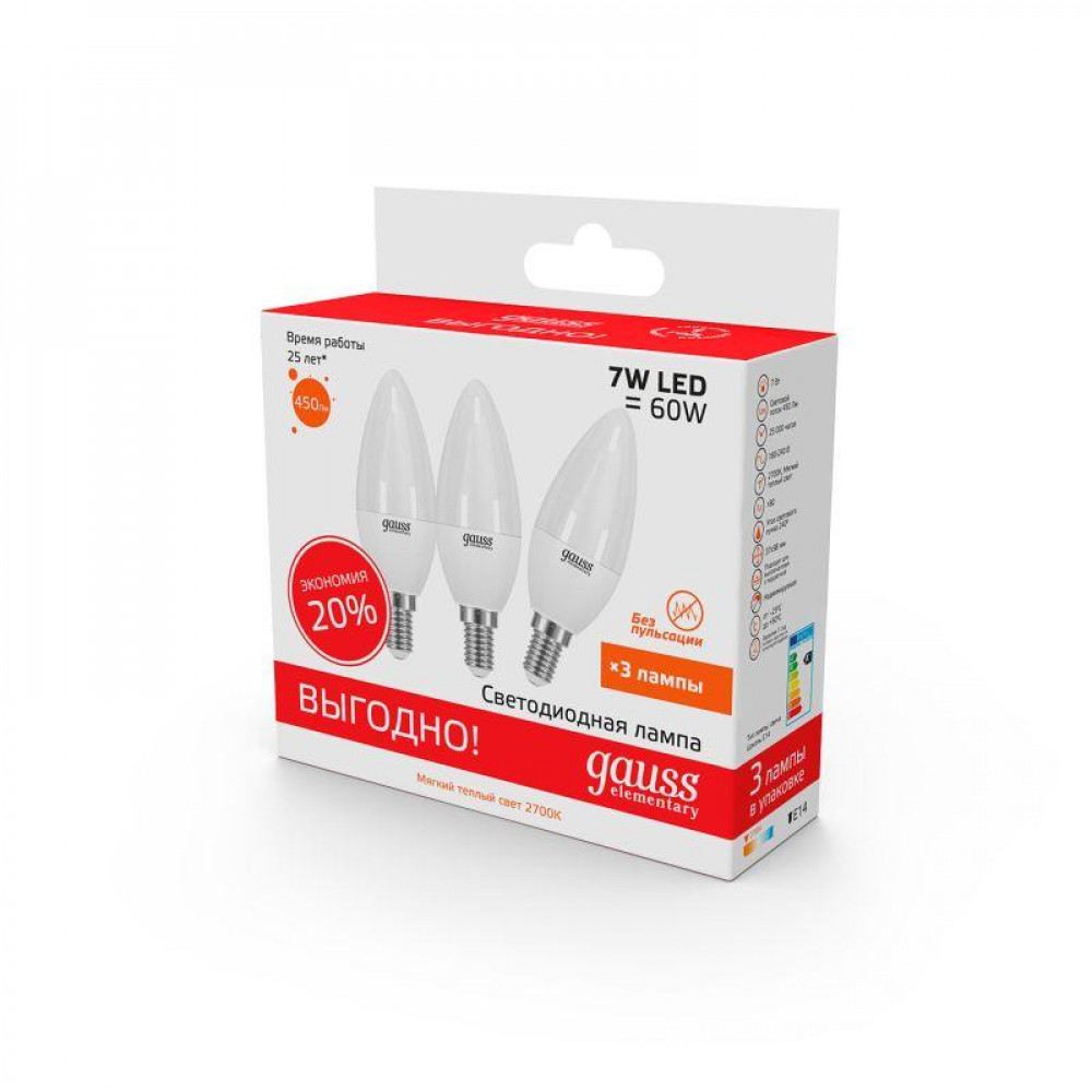 Лампа LED Elementary Candle 7W E14 2700K 1/40 (3 лампы в упаковке) 33117T, Лампа светодиодная