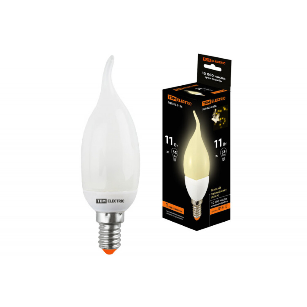 Лампа энергосберегающая КЛЛ-СW-11 Вт-2700 К–Е14 (свеча на ветру) (mini) SQ0323-0136, Лампа светодиодная
