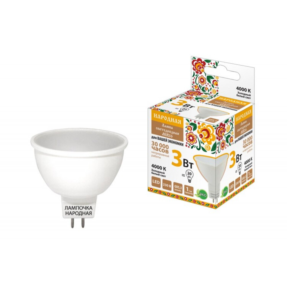 Лампа светодиодная MR16-3 Вт-230 В-4000 К–GU5,3 Народная SQ0340-0127, Лампа светодиодная