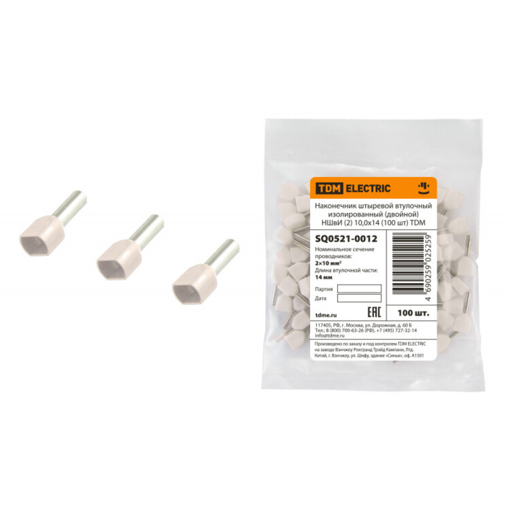 Наконечник штыревой втулочный изолированный (двойной) НШвИ (2) 10,0х14 (100 шт) SQ0521-0012, Наконечник, гильза