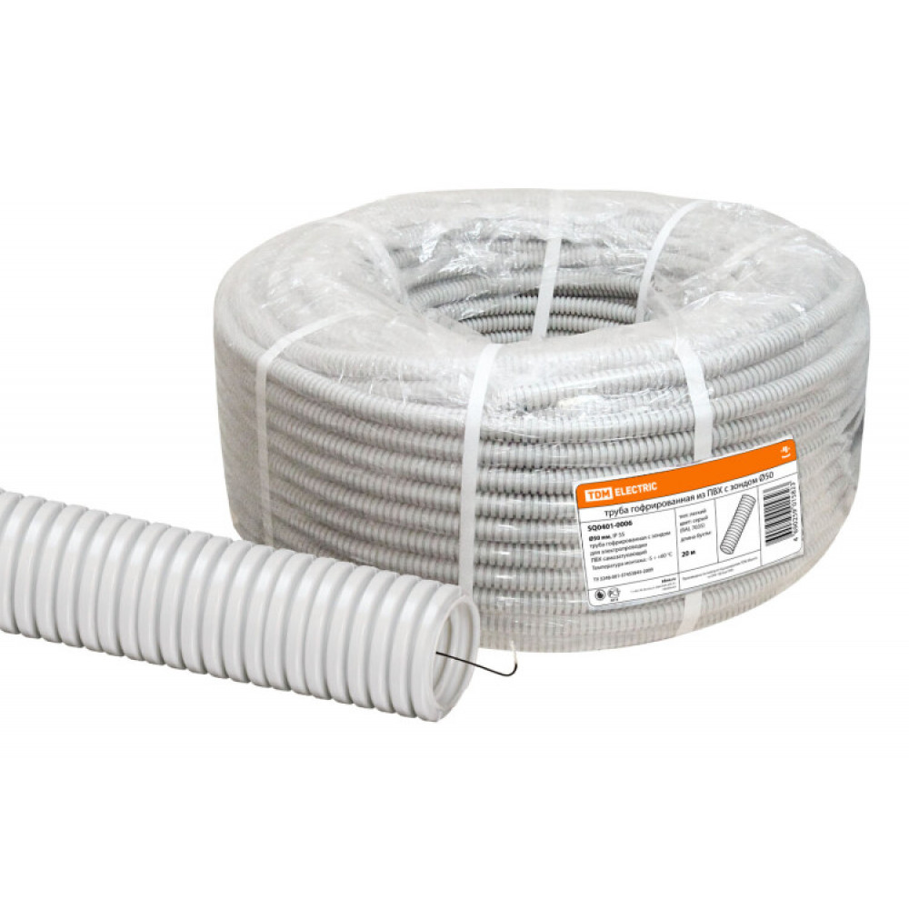 Труба гофрированная ПВХ d 50 с зондом (20 м) легкая SQ0401-0006, Труба и короб для прокладки кабеля