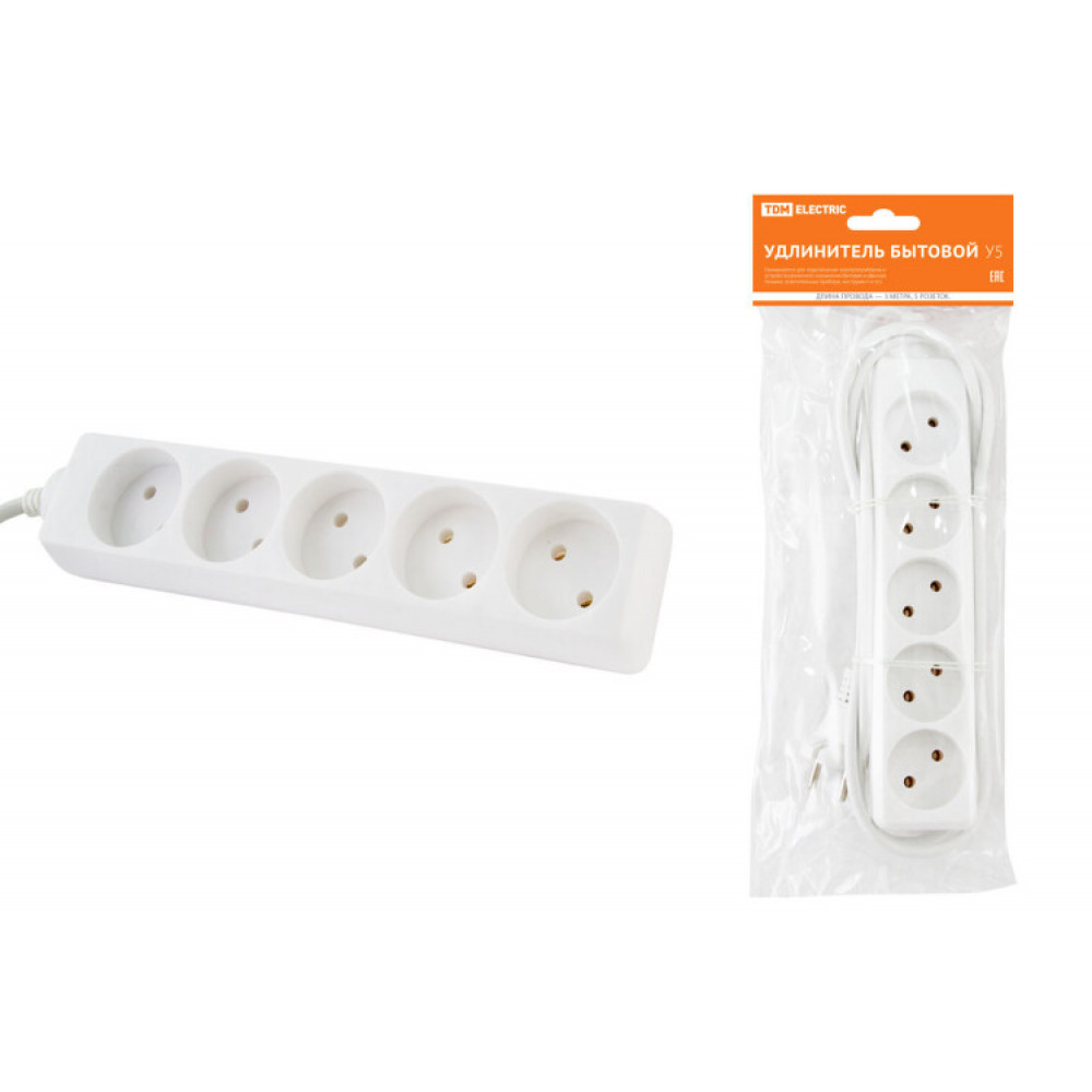 Удлинитель бытовой У5 5 гнезд, 3метра, без заземления, ПВС 2х0,75мм2 10А/250В SQ1303-0221, Удлинитель, сетевой фильтр