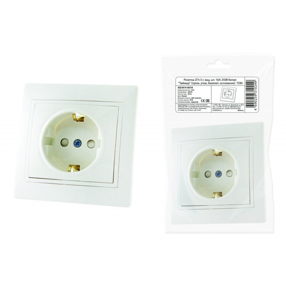 Описание Розетка 2П+З с защ. шт. 16А 250В белая "Таймыр" (пром. упак., бакелит. основание) SQ1814-0516