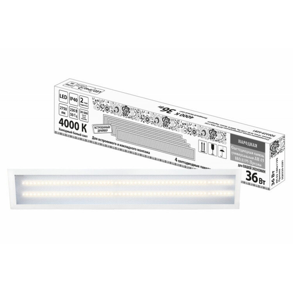 Описание Светодиодная панель универсальная ЛП 03 180х1195 Призма 19 мм 36 Вт 2750 Лм, 4000 К, белая, Народная SQ0329-0281