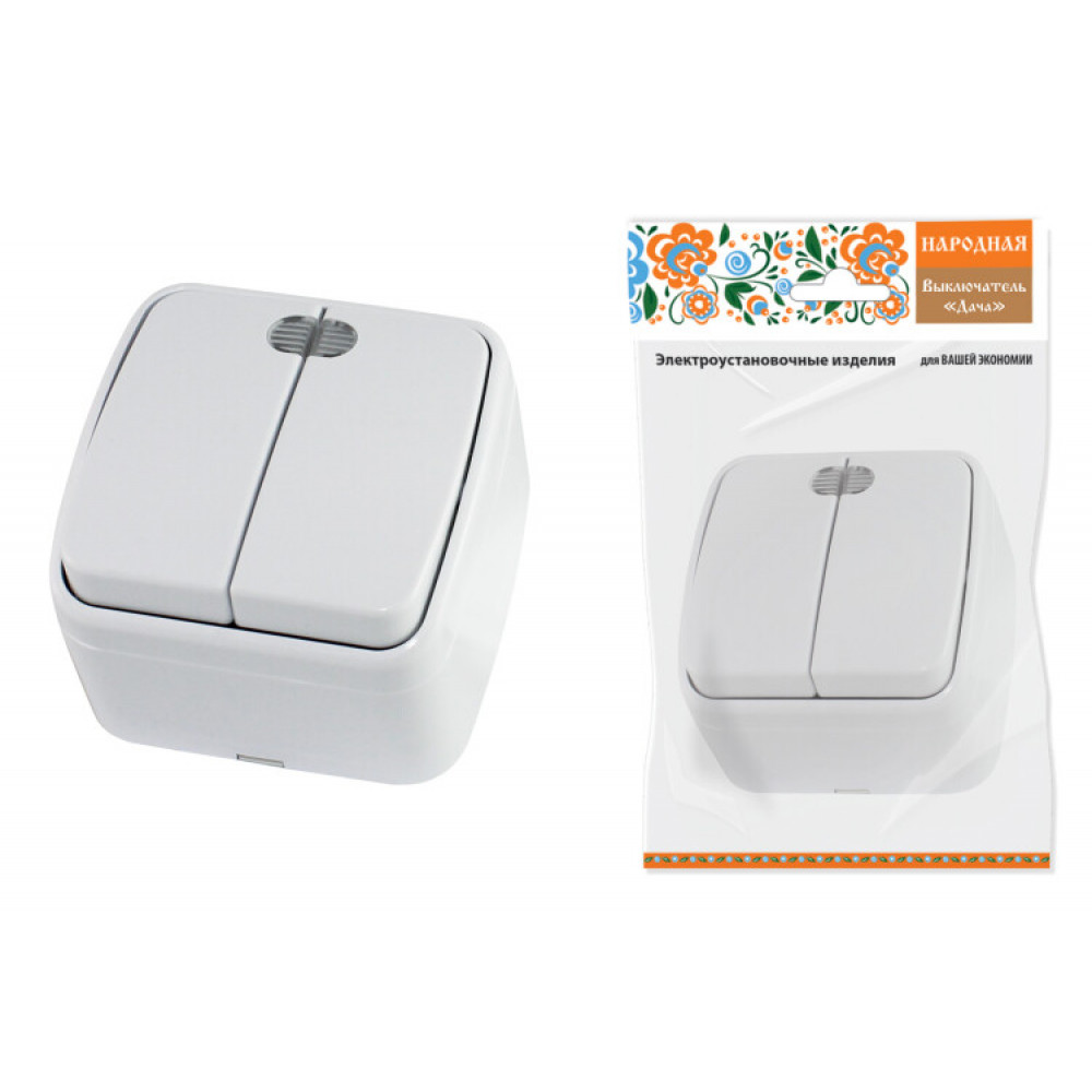 Описание Выключатель 2-кл. открытой установки с подсветкой IP20 10А, белый "Дача" Народная SQ1824-0004