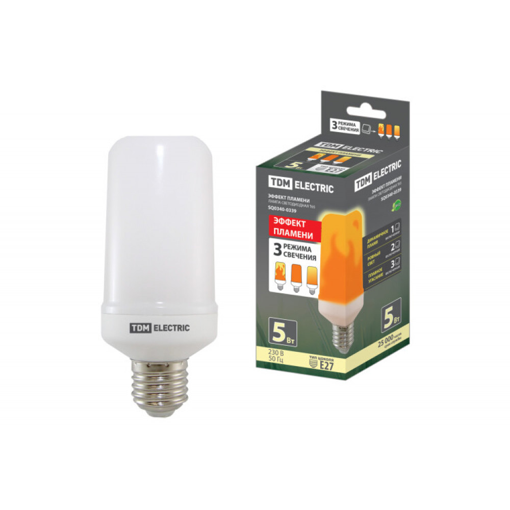 Описание Лампа светодиодная "Эффект пламени" Т65-5 Вт-230 В-1500 К-E27 (65х138) SQ0340-0339