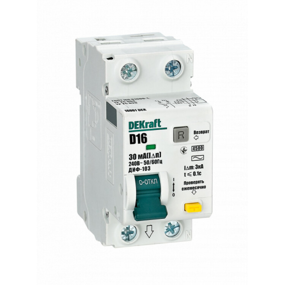 Описание АВДТ 1Р+N 16А 30мА тип AC х-ка D ДИФ-103 4.5кА C3(+) 16061DEK