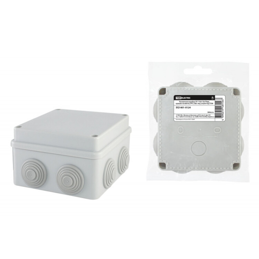 Описание Распаячная коробка ОП 110х110х70мм, крышка на винтах, IP55, 8вх. инд. штрих-код SQ1401-0124
