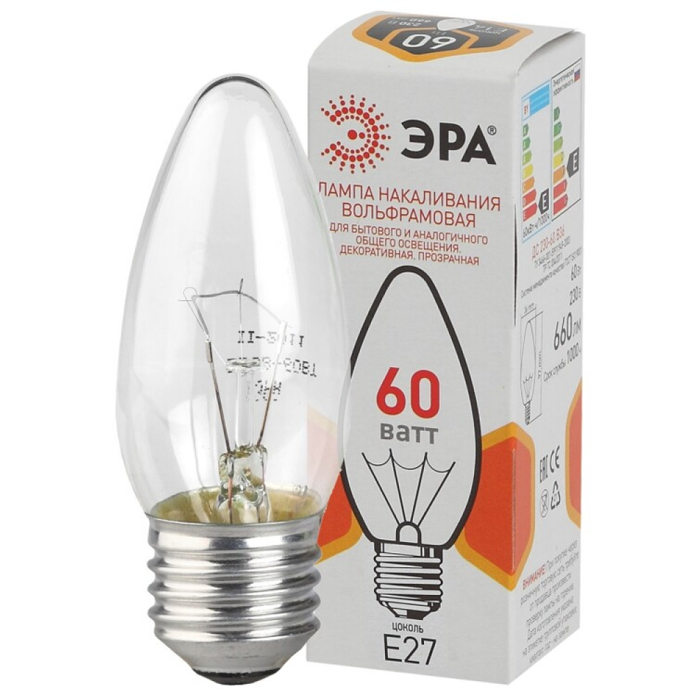 ДС (B36) свечка 60Вт 230В E27 цв. упаковка (100/6000) Б0039130, Лампа накаливания