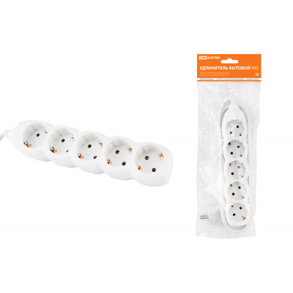 Описание Удлинитель бытовой У05 5 гнезд, 1,5метра, с заземлением, ПВС 3х1мм2 16А/250В SQ1303-0020