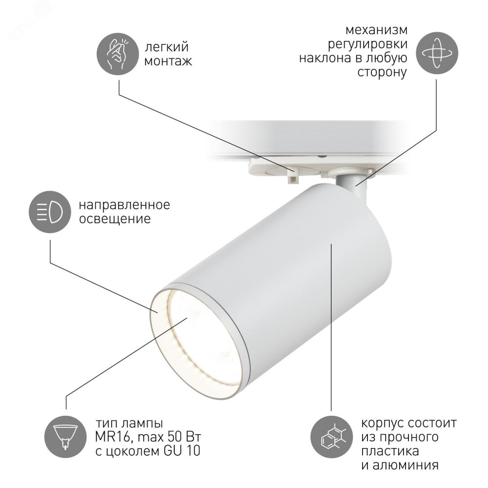 Однофазный трековый светильник под лампу GU10. Особенностью модели является современный утопленный трековый адаптер, который скрыт в шинопроводе и не отвлекает на себя внимание. Также модель комплектуется Г образным держателем, который визуально приближает светильник к шинопроводу, делая его эстетически более привлекательным. На тыльной части светильник имеет вентиляционные прорези для отвода горячего воздуха. Максимальная мощность лампы не должна превышать 15W.