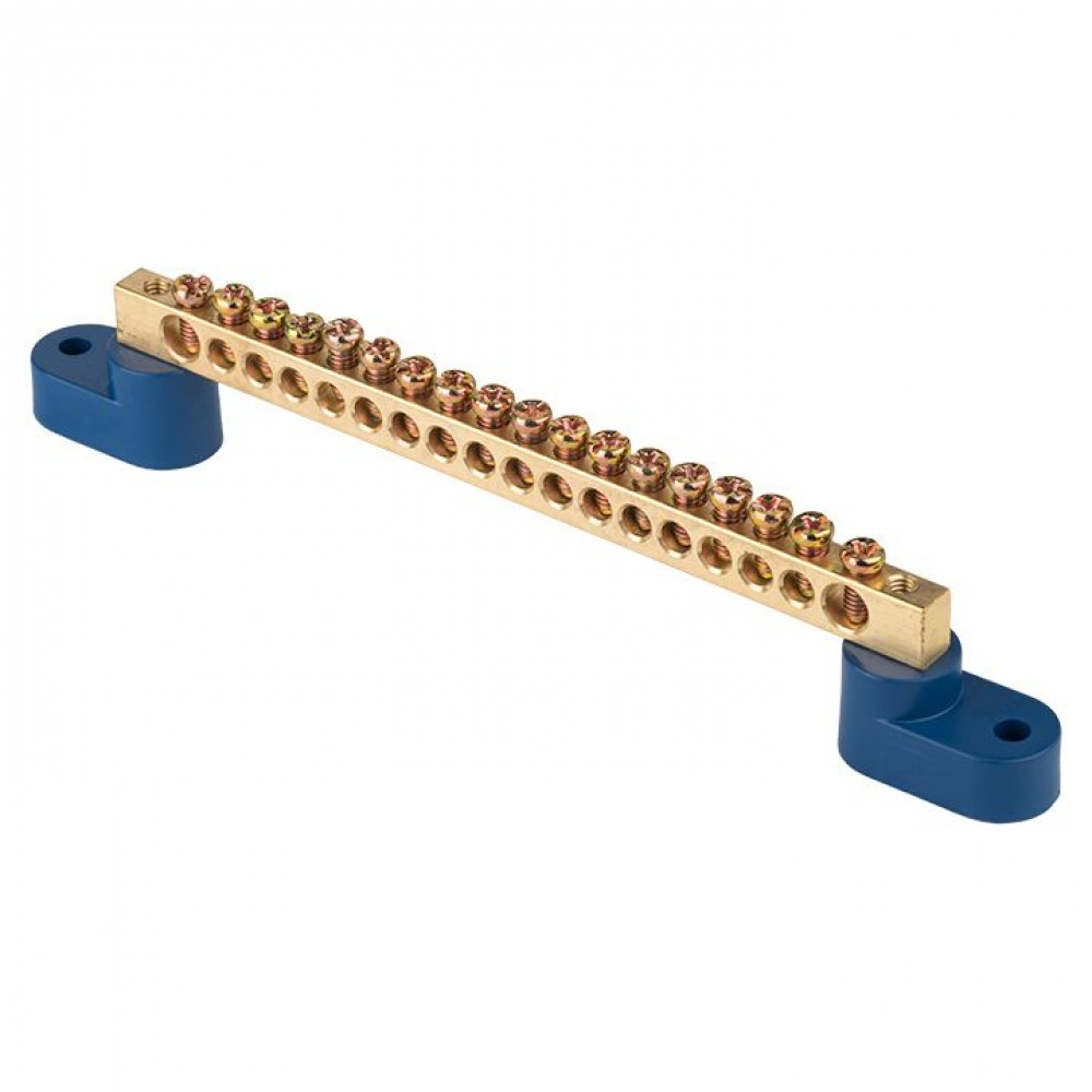 Шина "0" N (8х12мм) 18 отверстий латунь 2 синих угловых изолятора PROxima sn0-125-18-2, Блок клеммный и нулевая шина