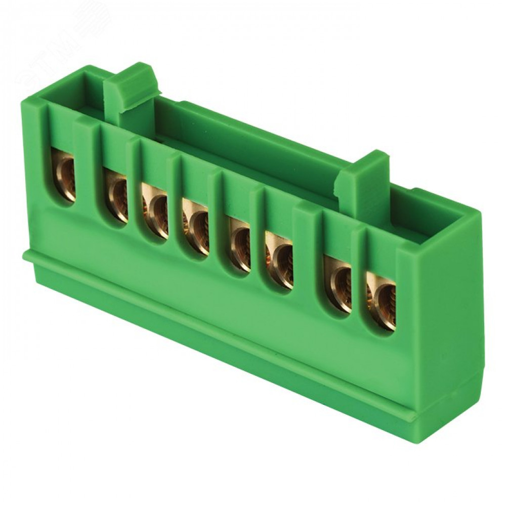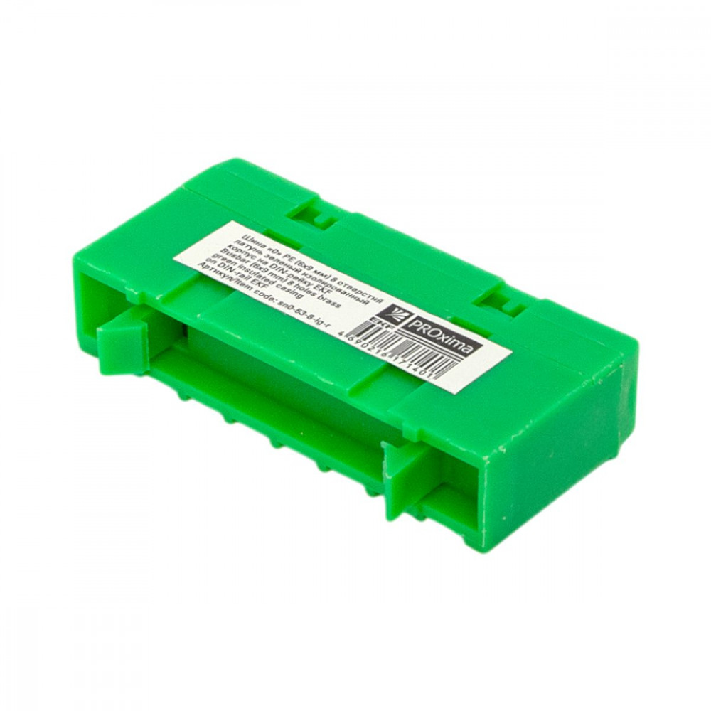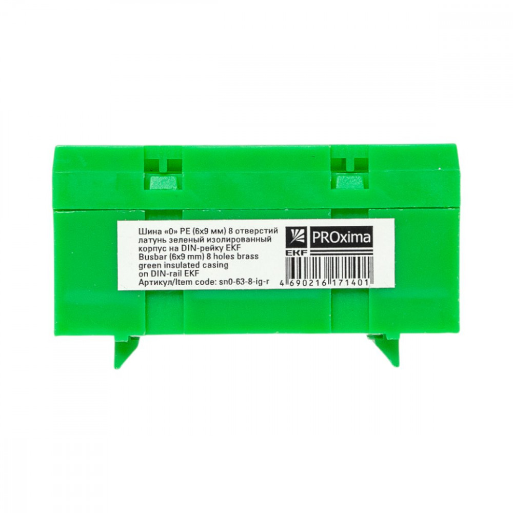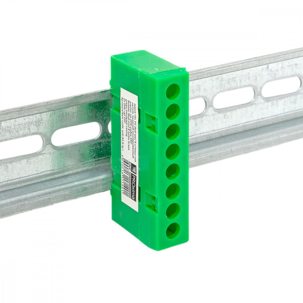 Описание Шина "0" PE (6х9мм) 8 отверстий латунь зеленый изолированный корпус на DIN-рейку розничный стикер PROxima sn0-63-8-ig-r