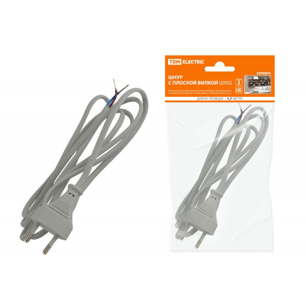 Описание Шнур с плоской вилкой ШУ02 ШВВП 2х0,75мм2 1,7 м. серебр. металлик SQ1305-0015