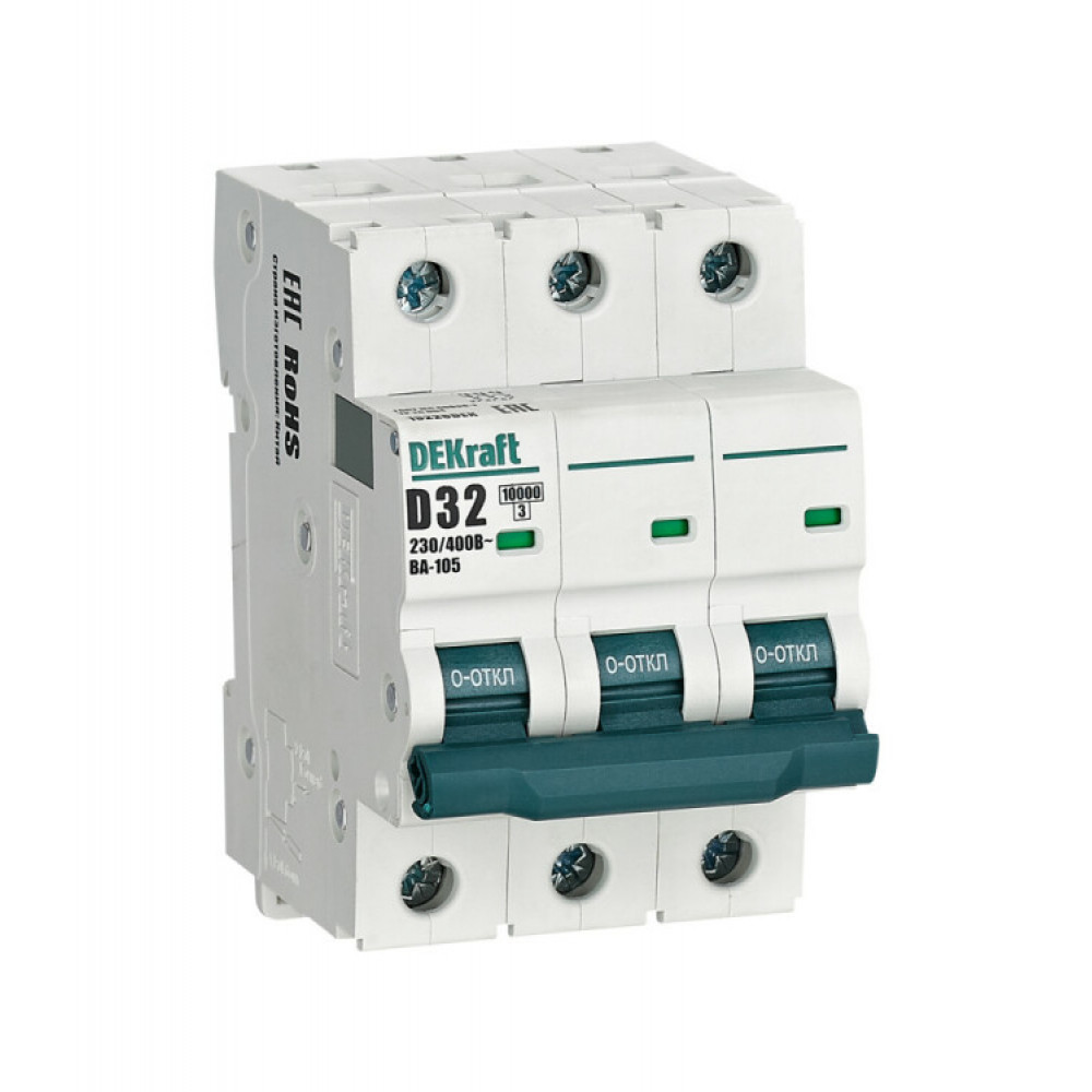 Автоматический выключатель серии ВА-105 DEKraft, 3P, ном. ток 32 А, характеристика D, откл. способность Icn 10 кА, установка - на DIN-рейку, ширина - 3 мод. х 18мм. Преимуществом выключателей ВА-105 является их высокая механическая и электрическая износостойкость — в 20 000 и 10 000 циклов соответственно. Аппараты ВА-105 имеют возможность применения независимых расцепителей на переменный и постоянный ток, а также возможность установки устройств на аппараты гребенчатых шин типа PIN.