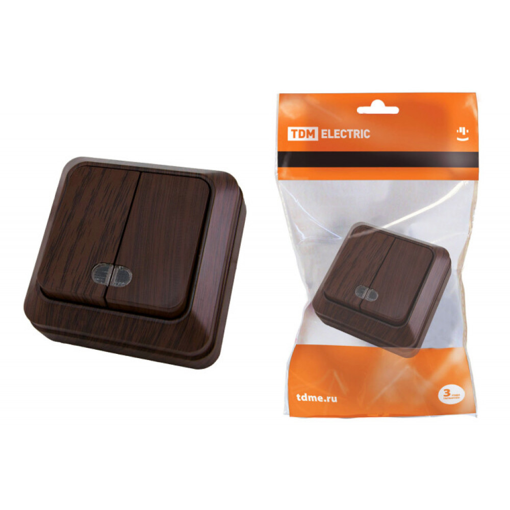 Описание Выключатель 2-кл. открытой установки с подсветкой IP20 10А, бук "Ладога" SQ1801-0030