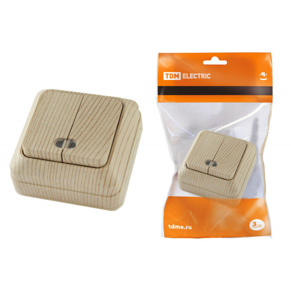 Выключатель 2-кл. открытой установки с подсветкой IP20 10А, сосна "Ладога" SQ1801-0046, Выключатель и переключатель открытого монтажа