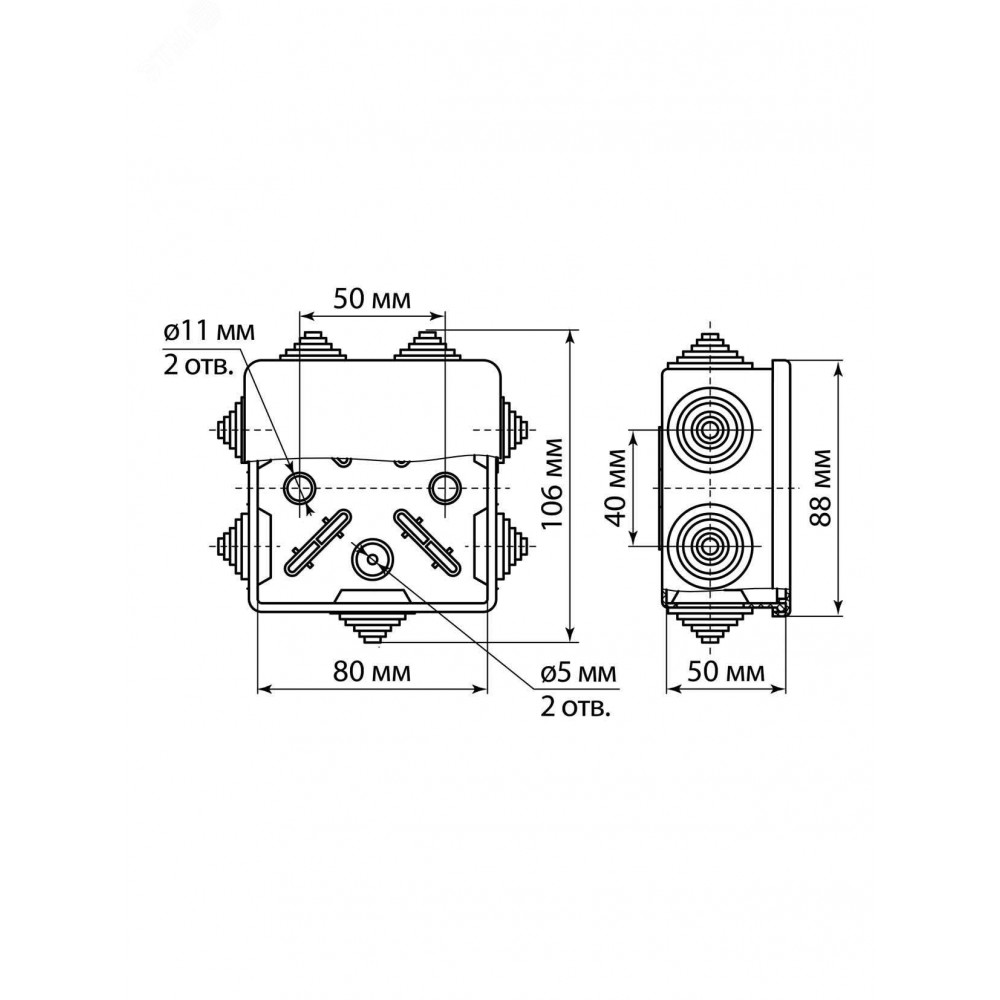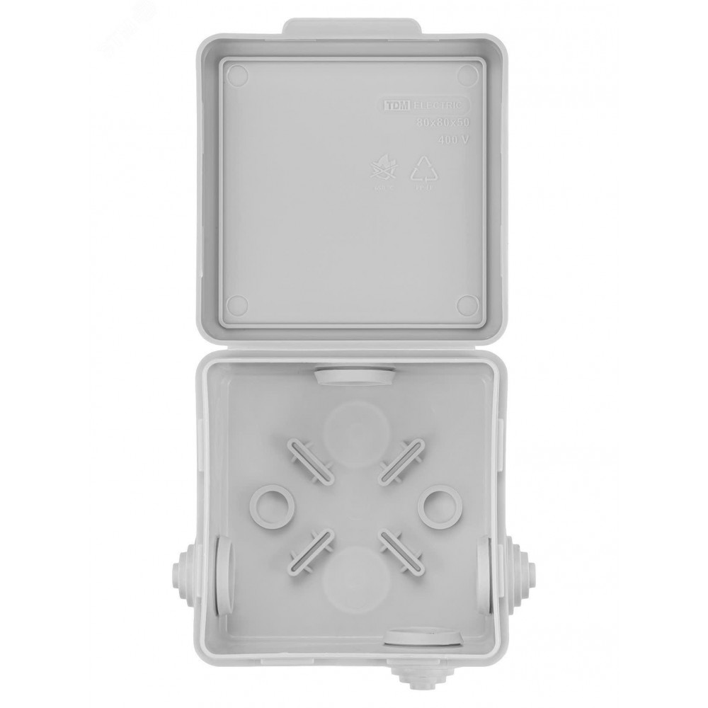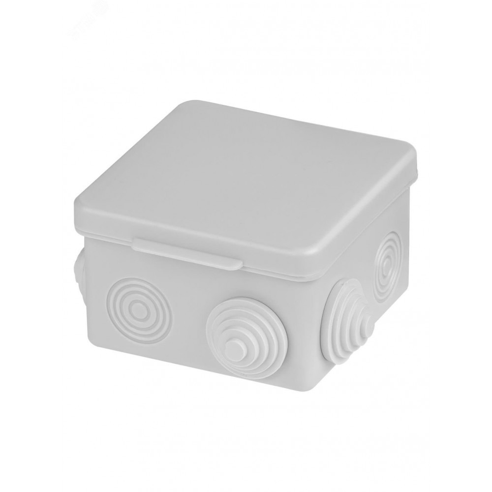 Описание Распаячная коробка ОП 80х80х50мм, крышка, IP54, 7вх. инд. штрихкод SQ1401-0512