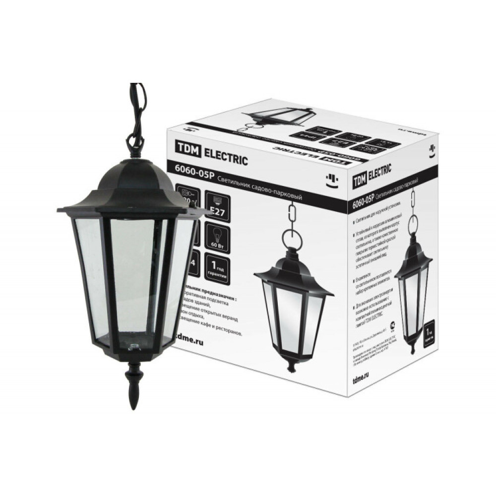 Описание Светильник 6060-05Р садово-парковый шестигранник, 60 Вт, подвес, черный, в разборе, Ч/Б, SQ0330-3004