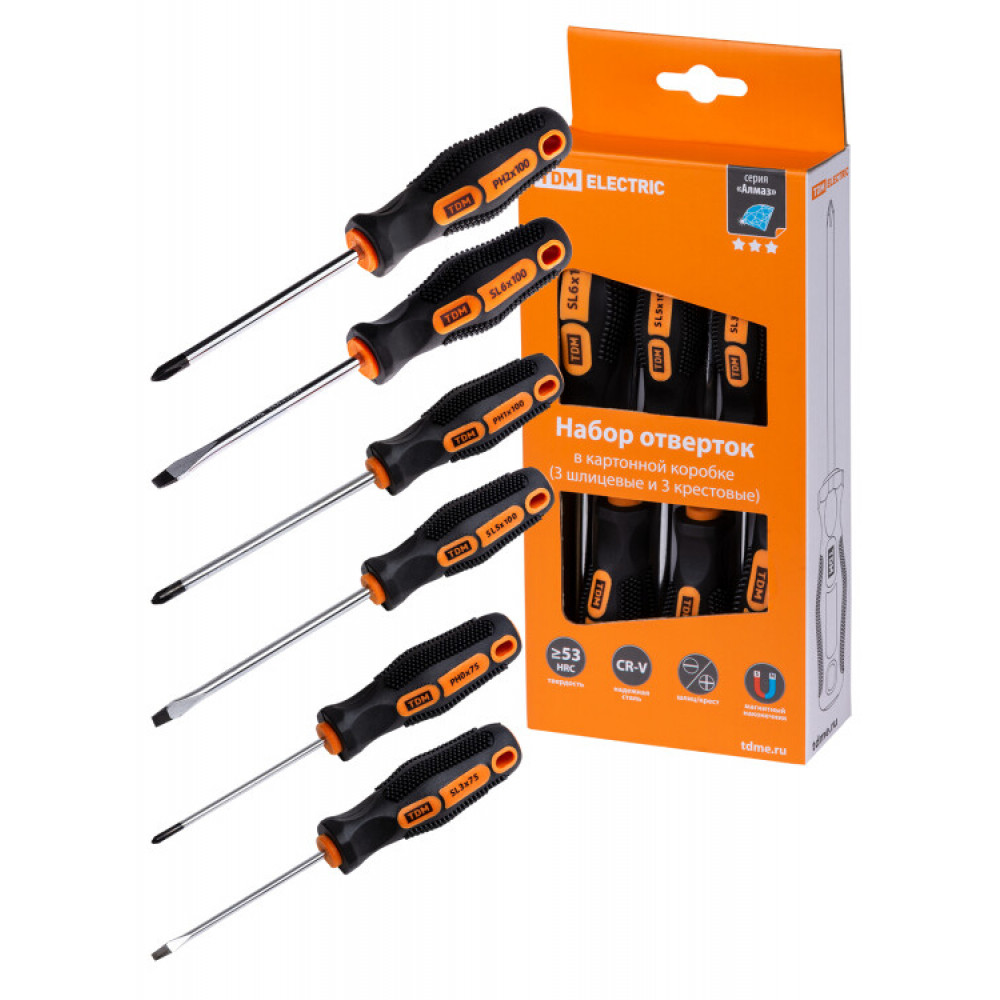 Описание Набор отверток 6 шт.: SL:3х75;5х100;6х100, PH:0х75;1х100;2х100 (карт. коробка), CR-V "Алмаз" SQ1013-0204