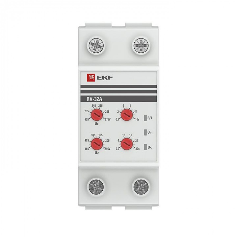 Реле напряжения EKF PROxima являются микропроцессорным устройством и предназначено для постоянного контроля напряжения в однофазных и трехфазных сетях (MRVA-3) переменного тока, для защиты электроустановок от перепадов напряжения. Реле контролирует напряжение в сети в установленном диапазоне и при выходе напряжения за пределы диапазона отключает оборудование от сети электропитания с заданной выдержкой времени. Установка диапазона напряжения и времени срабатывания производится с помощью поворотных регуляторов (RV-5A, RV-32F) либо при помощи кнопок (MRV, MRVA, MRVs) расположенных на лицевой поверхности реле. Реле напряжения EKF PROxima являются микропроцессорным устройством и предназначено для постоянного контроля напряжения в однофазных и трехфазных сетях (MRVA-3) переменного тока, для защиты электроустановок от перепадов напряжения. Реле контролирует напряжение в сети в установленном диапазоне и при выходе напряжения за пределы диапазона отключает оборудование от сети электропитания с заданной выдержкой времени. Установка диапазона напряжения и времени срабатывания производится с помощью поворотных регуляторов (RV-5A, RV-32F) либо при помощи кнопок (MRV, MRVA, MRVs) расположенных на лицевой поверхности реле.
