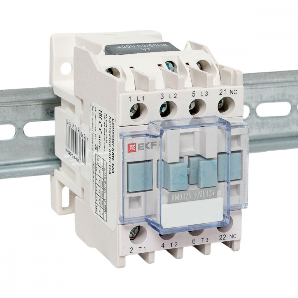 Контакторы КМЭ EKF PROxima состоят из корпуса, закрепленных в нем неподвижных контактов, подвижных контактов, которые закреплены в подвижной части магнитной системы. Неподвижная часть магнитной системы закреплена жестко в корпусе КМЭ. Пружина препятствует смыканию контактов. При подаче напряжения на катушку управления в магнитной системе контактора возникает магнитное поле, которое, преодолевая сопротивление пружины, смыкает магнитную систему и замыкает контакты. При отключении напряжения с катушки управления пружина размыкает контакты. Возможна коммутация алюминиевыми медным проводом.