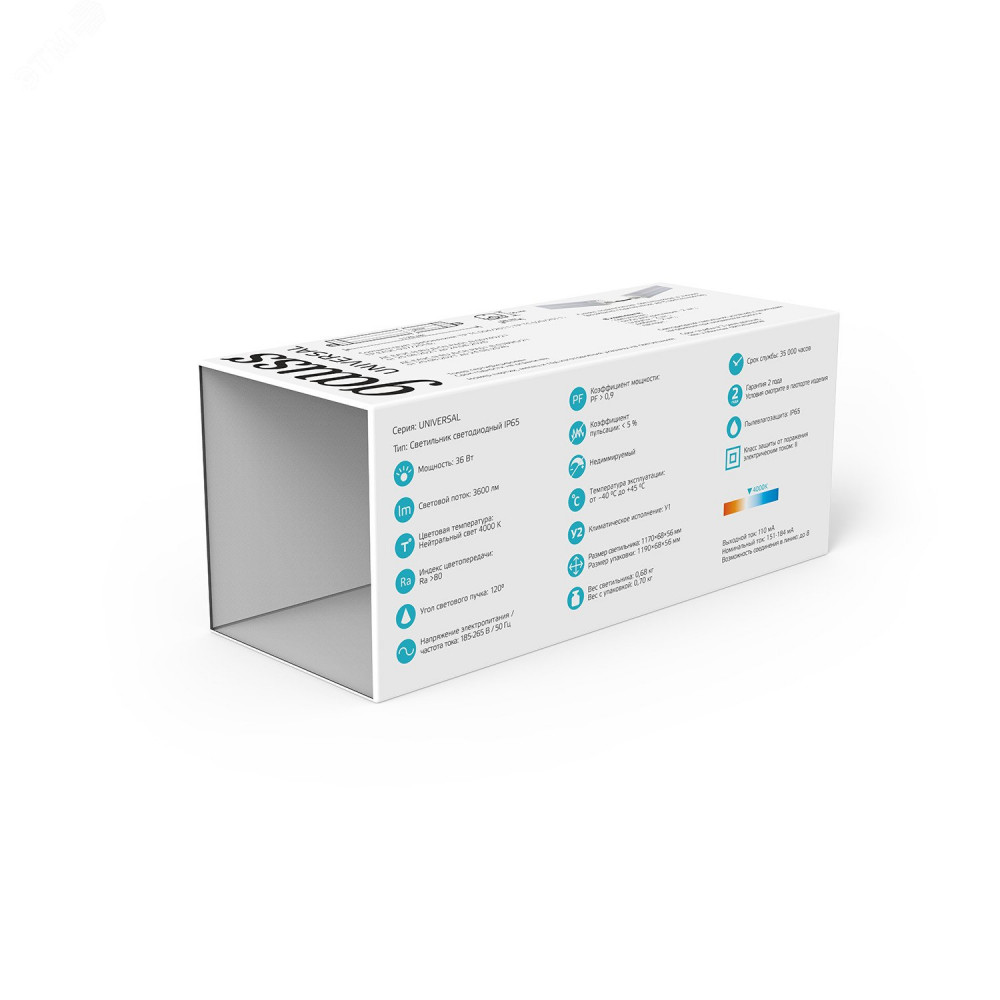 Линейный светильник Gauss UNIVERSAL с высоким уровнем защиты от пыли и влаги (IP65) предназначен для освещения различных помещений, таких как автомойки, парковки, подсобные помещения, пешеходные переходы и лестничные пролеты. Особенностью данной серии является возможность подключения до 20 светильников в линию, что упрощает и ускоряет монтаж, а также снижает издержки на материалах и услугах электромонтажников. Светильник оснащен качественными светодиодами Sanan с высокой светоотдачей и эффективностью до 90 лм/В, что позволяет эффективно освещать профессиональные помещения с высоким требованием к световому потоку. Широкий диапазон рабочих температур от -40 до +45 градусов обеспечивает стабильную работу светильника даже в экстремальных условиях окружающей среды. Цветовая температура в 4000 К обеспечивает ровный нейтральный белый свет и полноценное освещение в темное время суток, независимо от погодных условий.