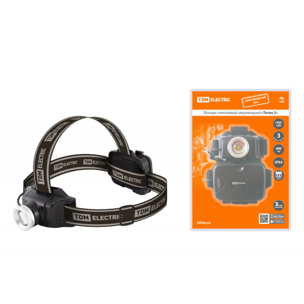 Описание Фонарь «Титан 3» налобный, 6 Вт 1 светодиод CREE 400 лм, 3хАА , IPX4, SQ0350-0100