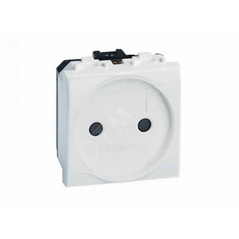 Силовая электрическая розетка штекерная, без заземления со шторками. Назначение- подключение оргтехники, бытовых приборов и т. п. Характеристики- в соответствии с ПУЭ, пункт 7.1.49 ? имеются защитные шторки, автоматически закрывающие гнезда штепсельной розетки при вынутой вилке, имеется заземление, диаметр отверстий для ввода кабелей ? 3 мм (по 2 отверстия на клемму), номинальный ток ? 16 А, номинальное напряжение ? 250 B. Кол-во модулей- 2. Цвет- слоновая кость