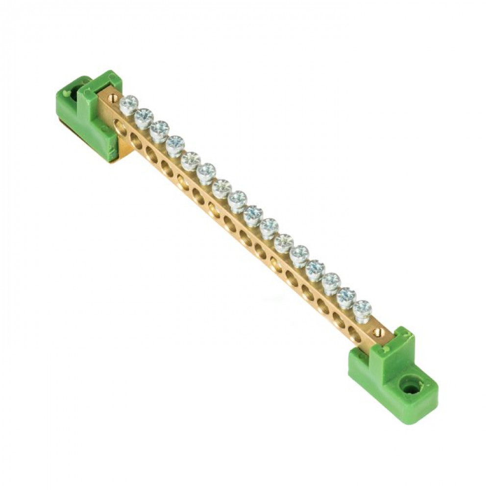 Шина "0" PE 6x9мм 16 отверстий латунь с контактной пластиной 2 зелёных угловых изолятора PROxima sn0-63-16-2-pe, Блок клеммный и нулевая шина