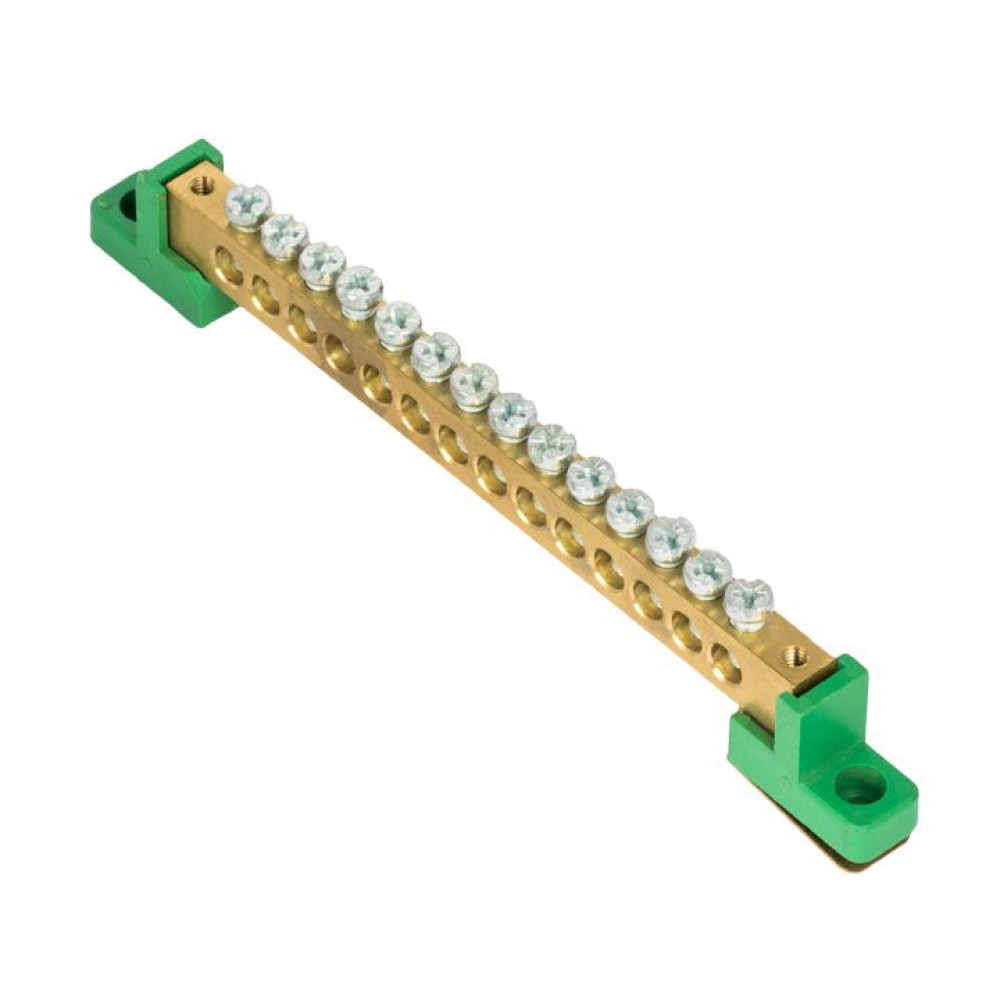 Шина "0" PE 8x12мм 14 отверстий латунь с контактной пластиной 2 зелёных угловых изолятора PROxima sn0-125-14-2-pe, Блок клеммный и нулевая шина