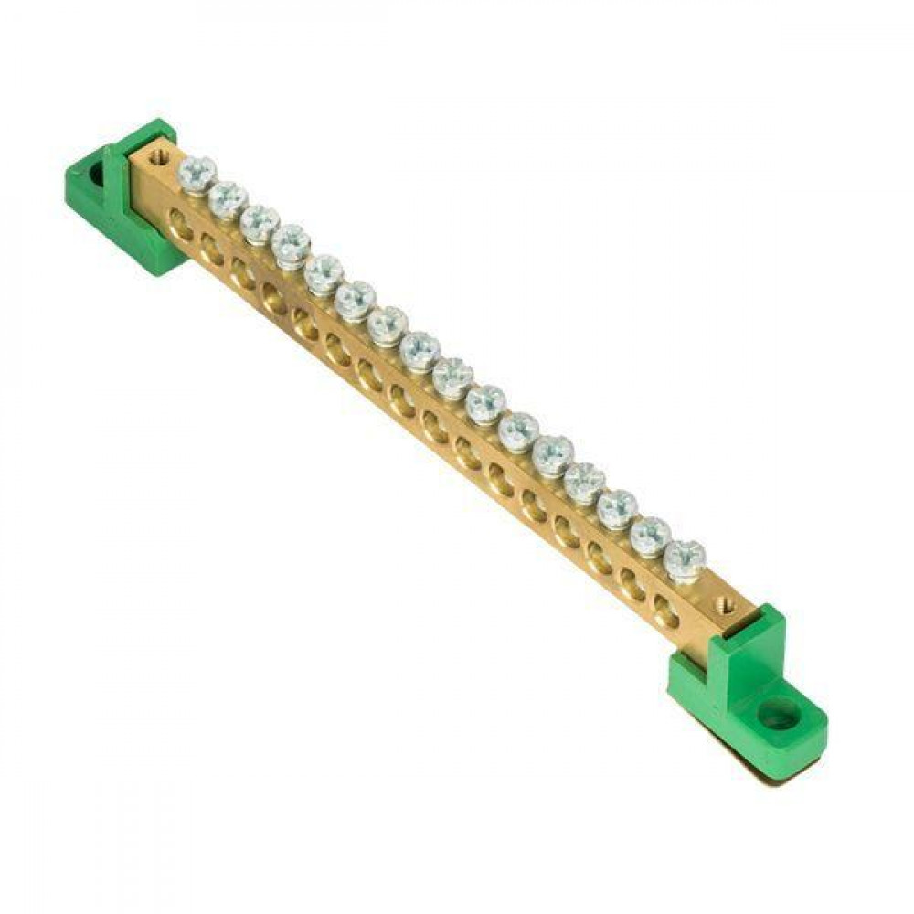 Шина "0" PE 8x12мм 16 отверстий латунь с контактной пластиной 2 зелёных угловых изолятора PROxima sn0-125-16-2-pe, Блок клеммный и нулевая шина