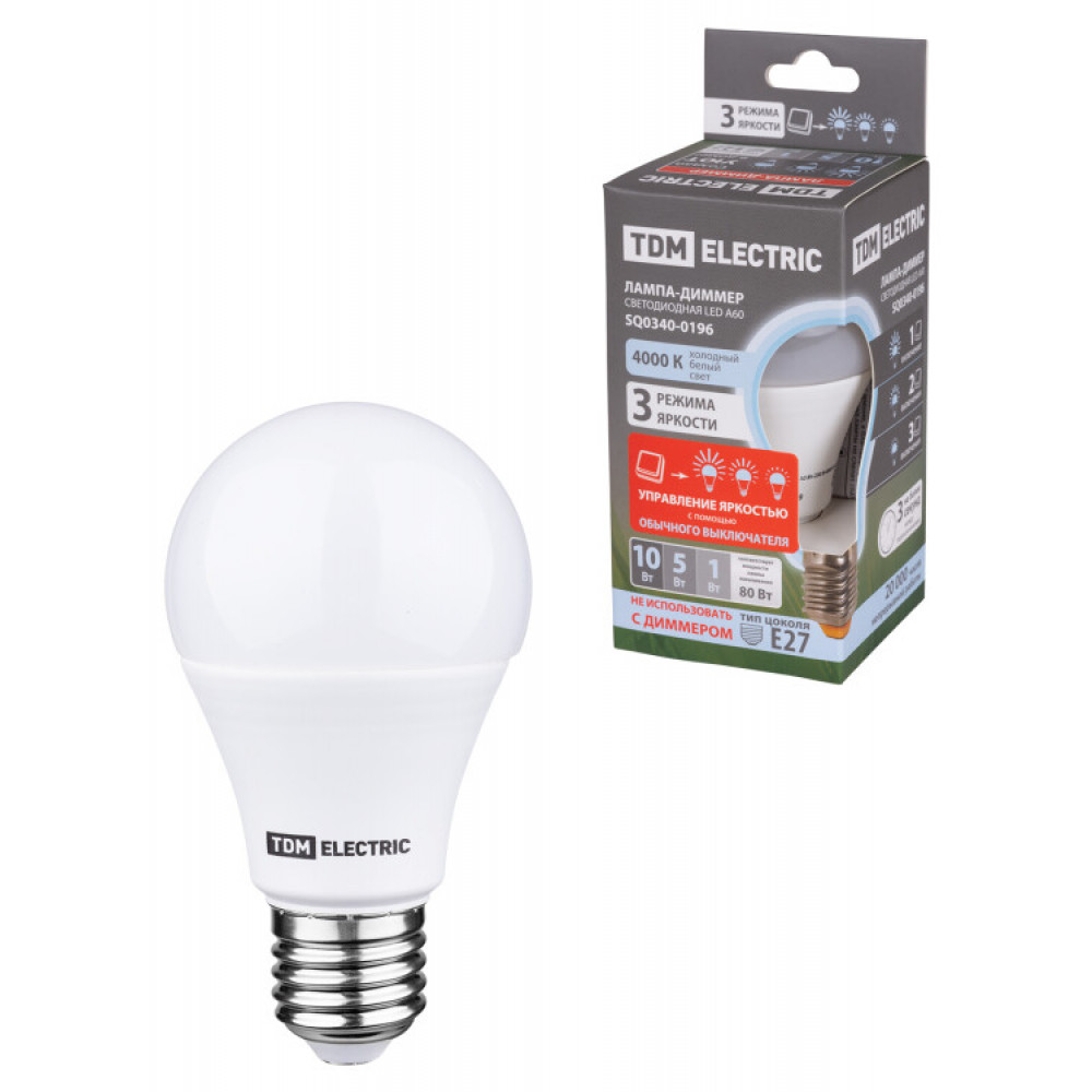 Лампа светодиодная А60 - 10 Вт-230 В -4000 К–E27 "Лампа-ДИММЕР" SQ0340-0196, Лампа светодиодная