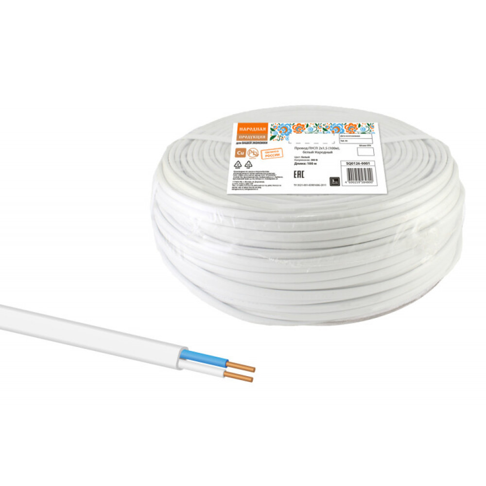 Провод ПУСП 2х1,5 (100м), белый Народный SQ0126-0001, Кабель и провод силовой для стационарной прокладки