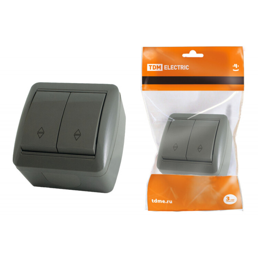 Описание Выключатель на 2 направления 2-кл. открытой установки IP44 10А серый "Селигер" SQ1818-0112