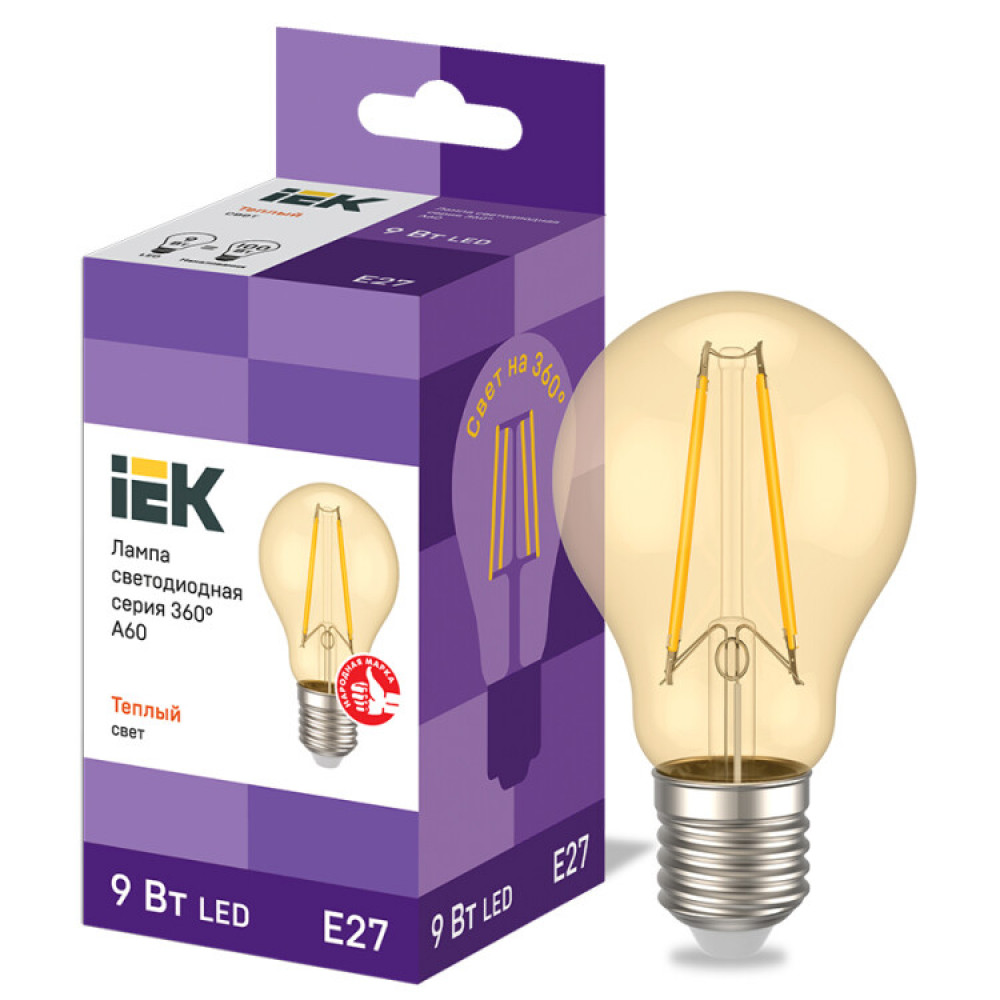 Лампа LED A60 груша золото 9Вт 230В 2700К E27 серия 360° IEK с нитевидным светодиодом (филаментная нить) является одним из самых эффективных источников света.