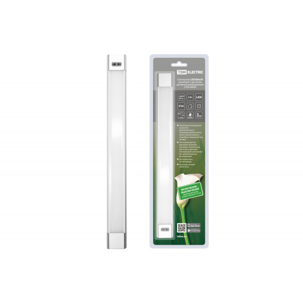 Описание Светильник LED300х30 линейный, 5 Вт, 230 В, датчик движения, диммер, 2700-6000К, SQ0329-3605